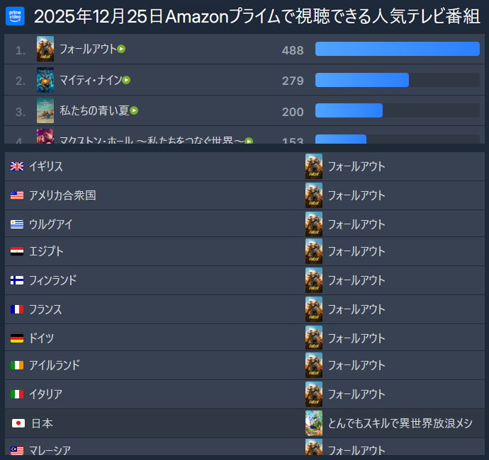 【悲報】各国の人気番組 米「フォールアウト」英「フォールアウト」独「フォールアウト」日「 」 2025/12/28 トレンド https://alfalfalfa.com/articles/10983623.html 1: — (@Vault76info) https://www.youtube.com/watch?v=uEk_lA3yczY document.write(” + ”); 関連記事 ナイツ塙「M-1王者に翌日の情報番組で『昨日優勝したネタどうぞ』ってやらせるのやめてあげてほしい アッコにおまかせ!の後番組、上田晋也におまかせ! 【悲報】島田紳助が仕切ってた時代のテレビ番組の雰囲気、気持ち悪い 【悲報】北村弁護士、河野太郎氏から共演番組で訴訟宣告されるwwwwwwwwwwww「ダメなものはダメ」 松本人志「音楽番組始まります」 【画像】飲み会でちょっと離れた席に座ってる男を一撃で刈り取る女wwwwwwwwwwwwwwww document.write(” + ”); 続きを読む ——— Source: alfalfalfa.com 【悲報】各国の人気番組 米「フォールアウト」英「フォールアウト」独「フォールアウト」日「 」