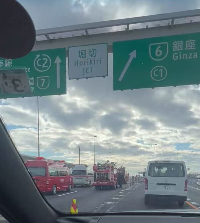 首都高事故。堀切JCTの湾岸方面横転事故。通行止め。