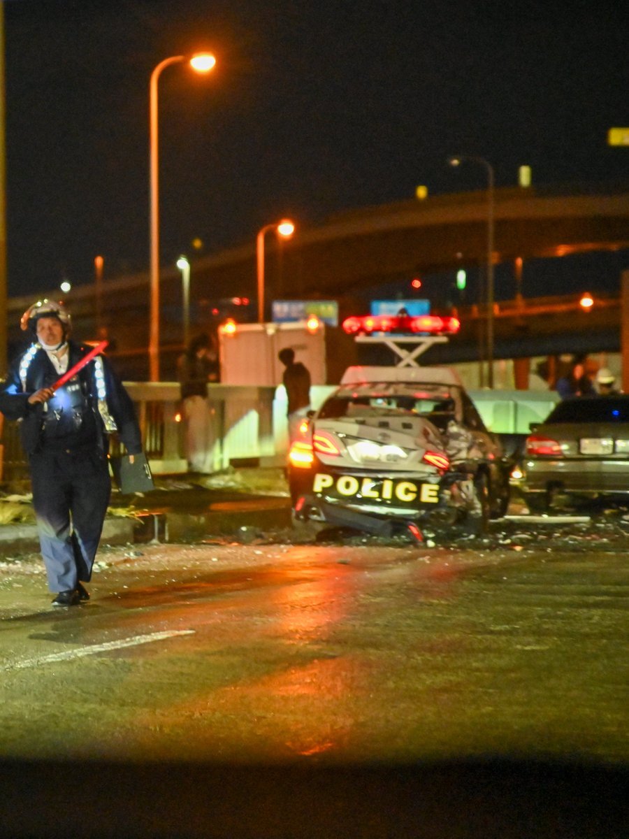 市川大橋の凍結でパトカー含む5台がひっくり返ったり衝突していました。