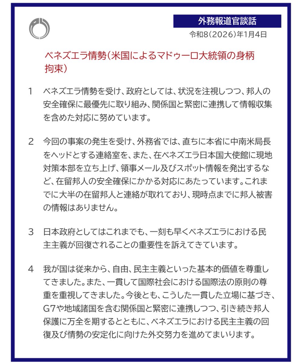 【速報】日本外務省、ベネズエラ騒動に当たり障りのない神コメントwwwwwwwwww 2026/1/4 トレンド 1: 草 document.write(” + ”); 関連記事 【警告】アメリカ「ベネズエラが政権移行に協力しなければ再攻撃する」 【悲報】トランプ、ベネズエラの石油権益確保しに行くと発言wwwwwwwwwww 【悲報】ベネズエラ大統領マドゥロさん、副大統領に裏切られていた事が判明するwwwwwwwwwww 【動画】トランプがベネズエラ軍事施設攻撃を指示 ←何でいきなり戦争してんだ? 【速報】米トランプ「ベネズエラに大規模爆撃して大統領を拘束しました」 【画像】飲み会でちょっと離れた席に座ってる男を一撃で刈り取る女wwwwwwwwwwwwwwww document.write(” + ”); 続きを読む ——— Source: alfalfalfa.com 【速報】日本外務省、ベネズエラ騒動に当たり障りのない神コメントwwwwwwwwww