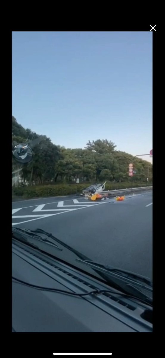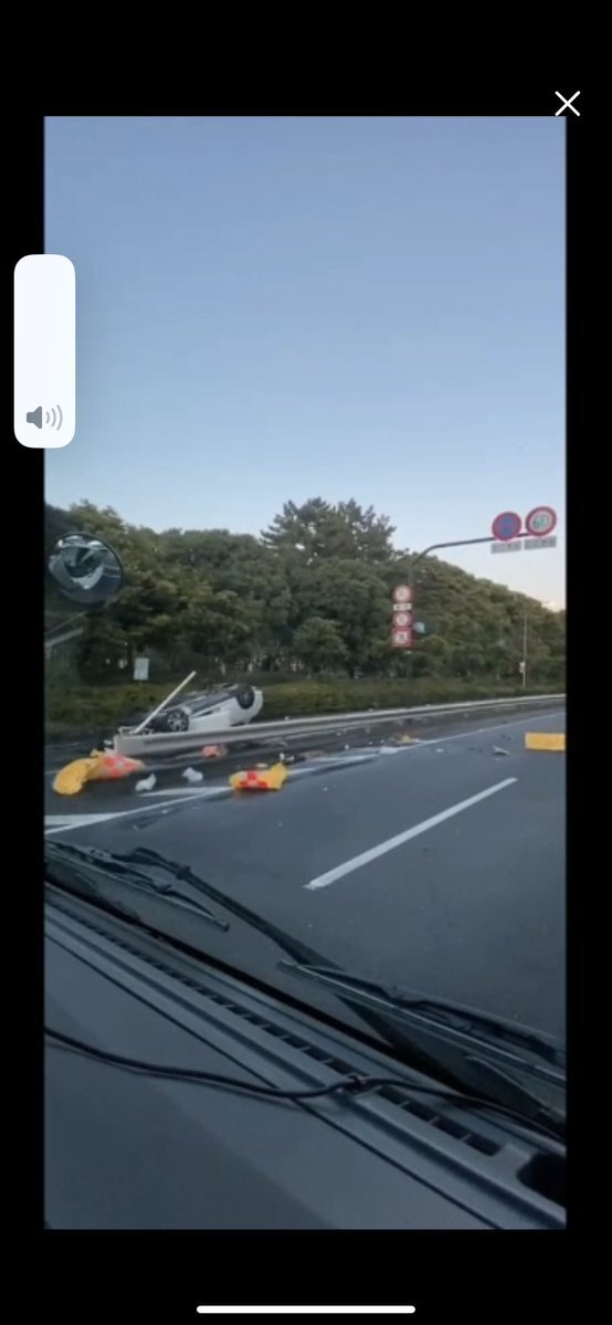 『夢の島方面に行く側道入口のドラムクッションに突っ込んだと思われる白いプリウスみたいな奴が完全にひっくり返ってて側道完全封鎖