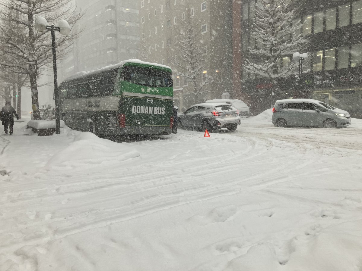 『札幌市中央区北2条西2丁目19付近、バスが路肩で立ち往生しているようです』