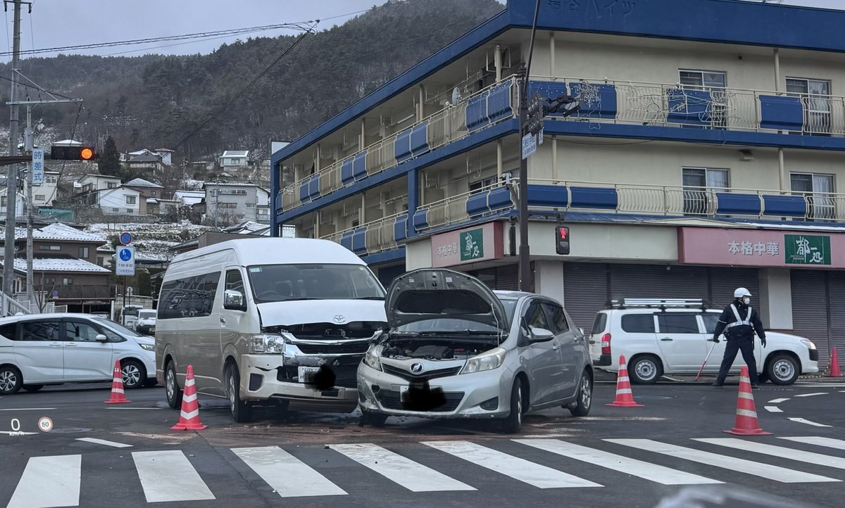 【現場の状況】#交通情報 県道37号線 長野県長野市上松 湯谷小学校西交差点付近 ワゴン車と乗用車の衝突事故で交通規制1月8日 #長野
