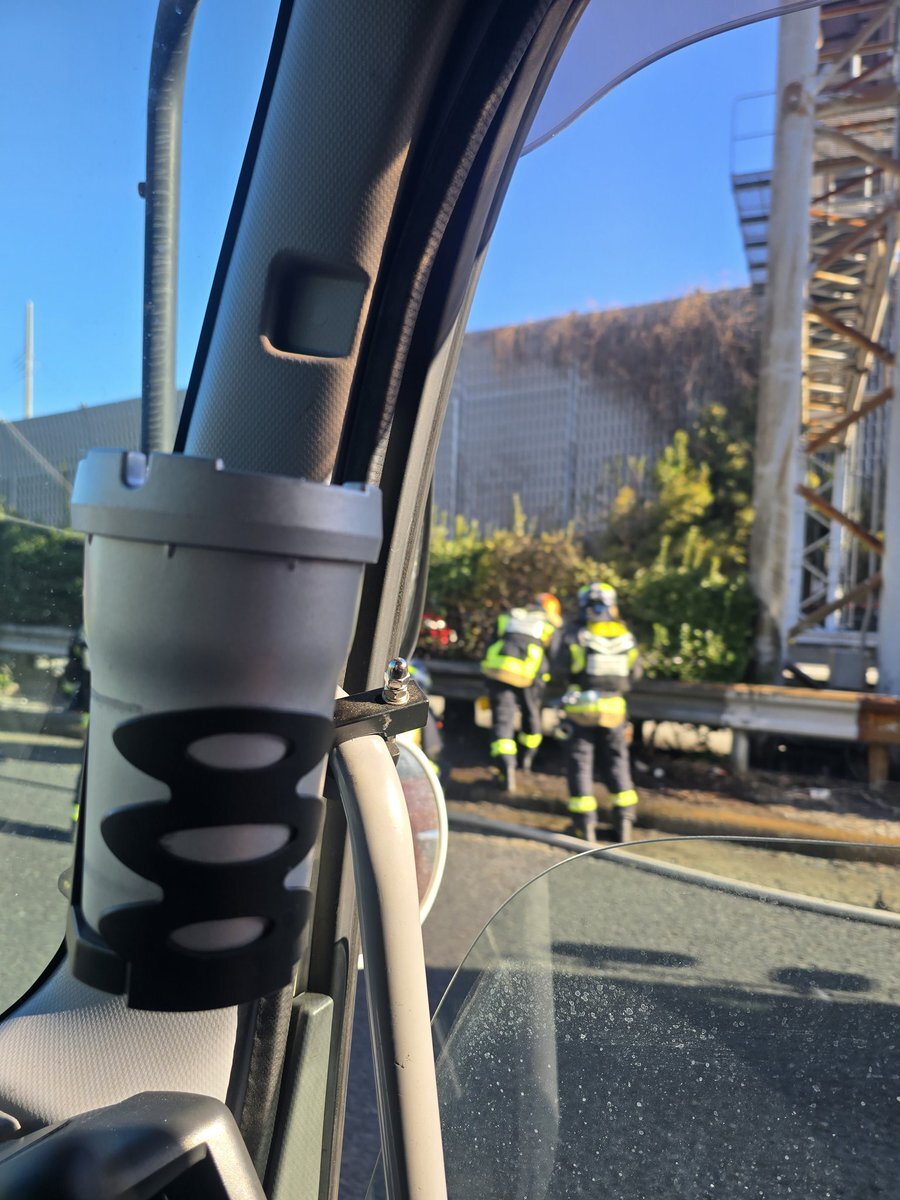 東名高速の綾瀬バス停付近で中央分離帯の植木が燃えてた…