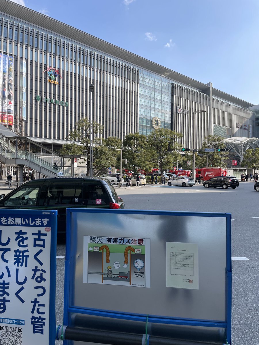 『博多駅、消防車、パトカーいて道開けてってめっちゃいってるのこわー』