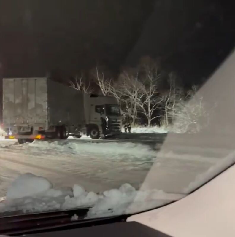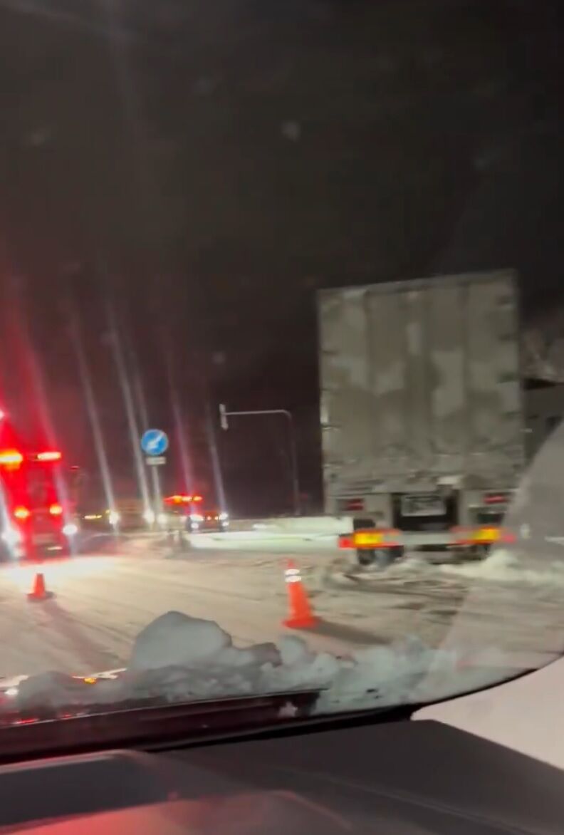 『ここら辺でトラックが道を塞ぐような事故が起こり36号線苫小牧方面は通行止めになりまーす』