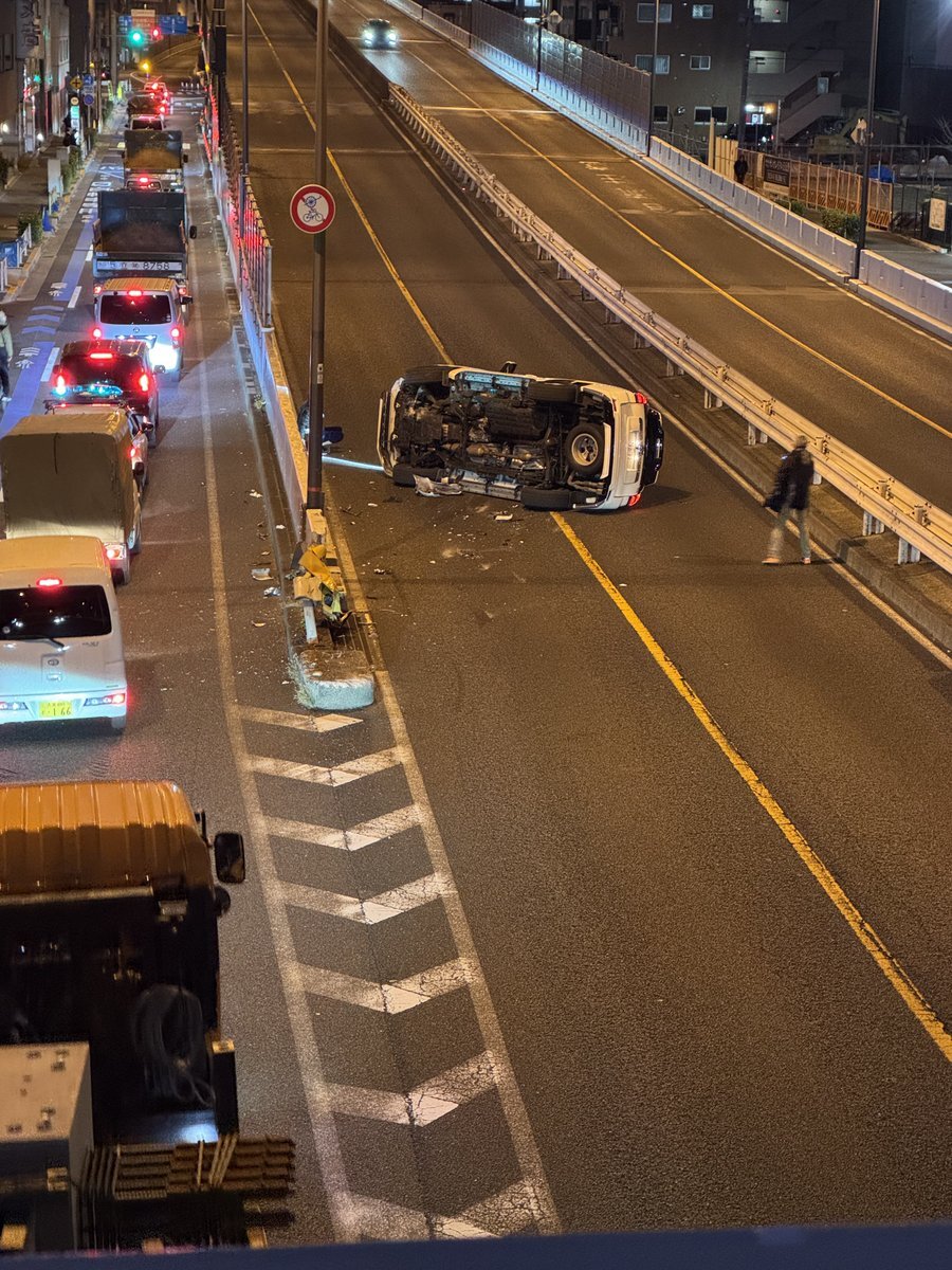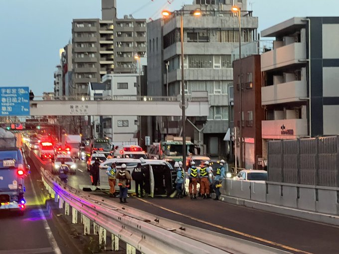 千住新橋 手前にて車線を塞ぐ横転事故