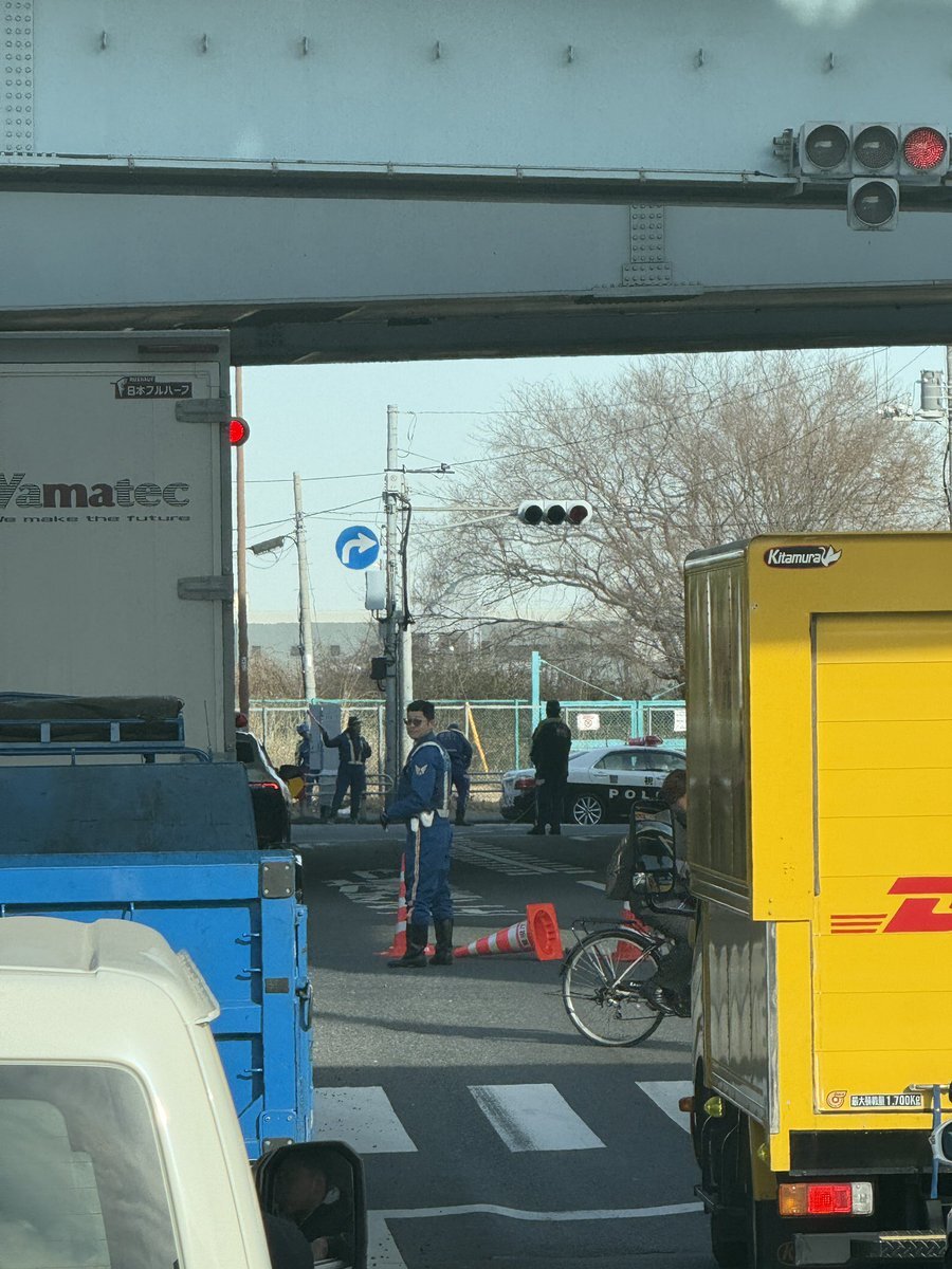 【現場の状況】#交通情報 国道357号線 東京都江東区新木場 夢の島交差点付近 トラックと自転車の事故で交通規制渋滞1月15日 #江東区 #新木場