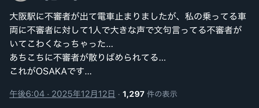『大阪で危険物持って走り回ってるやついるらしいあとひと駅で大阪なのに電車止まってて鬱もうちょっとでライブ始まるんですけど』