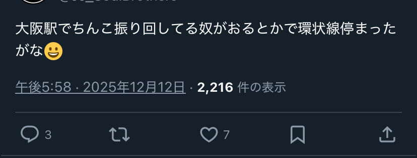 天満と大阪の間の電車内に閉じ込められてるこっちの身にもなってくれよ笑笑— スベスベマンジュウガニ (@Vhe2DUdgxT91693) December 12, 2025