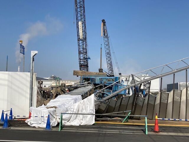 重機の先端部分は、フェンスを突き破って歩道に倒れましたが、歩行者などの被害はありませんでした。