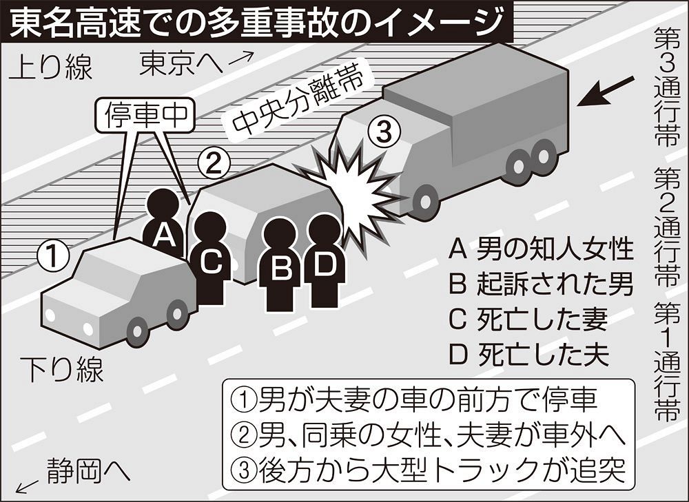 判決によると、17年6月5日、パーキングエリアで静岡市の萩山嘉久さん=当時(45)=に駐車位置を非難され、逆上して追走。あおり運転で停止させ、後続トラックの追突で萩山さんと妻=同(39)=を死亡させ、娘2人にけがをさせた。